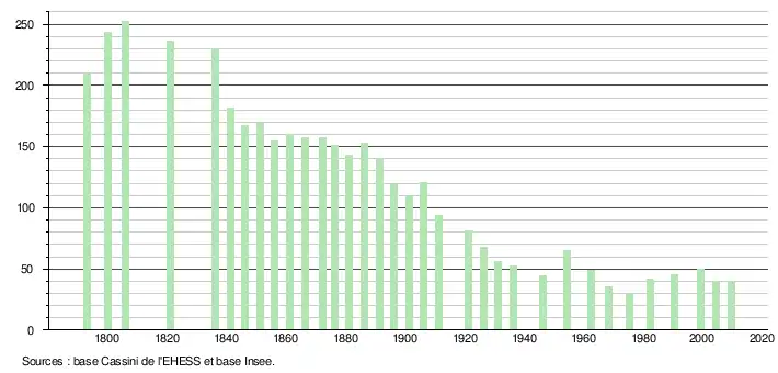 L'évolution du nombre d'habitants est connue à travers les recensements de la population effectués dans la commune depuis 1793. À partir du , les populations légales des communes sont publiées annuellement dans le cadre d'un recensement qui repose désormais sur une collecte d'information annuelle, concernant successivement tous les territoires communaux au cours d'une période de cinq ans. Pour les communes de moins de 10 000 habitants, une enquête de recensement portant sur toute la population est réalisée tous les cinq ans, les populations légales des années intermédiaires étant quant à elles estimées par interpolation ou extrapolation[3]. Pour la commune, le premier recensement exhaustif entrant dans le cadre du nouveau dispositif a été réalisé en 2004[4],[Note 1].