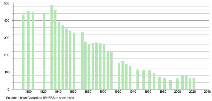 L'évolution du nombre d'habitants est connue à travers les recensements de la population effectués dans la commune depuis 1793. Pour les communes de moins de 10 000 habitants, une enquête de recensement portant sur toute la population est réalisée tous les cinq ans, les populations légales des années intermédiaires étant quant à elles estimées par interpolation ou extrapolation[16]. Pour la commune, le premier recensement exhaustif entrant dans le cadre du nouveau dispositif a été réalisé en 2006[17].