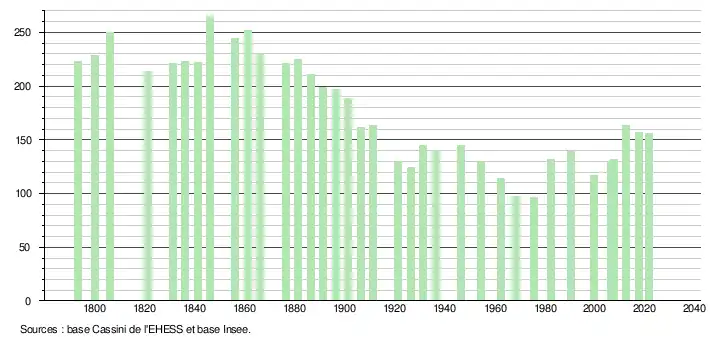 L'évolution du nombre d'habitants est connue à travers les recensements de la population effectués dans la commune depuis 1793. Pour les communes de moins de 10 000 habitants, une enquête de recensement portant sur toute la population est réalisée tous les cinq ans, les populations légales des années intermédiaires étant quant à elles estimées par interpolation ou extrapolation[16]. Pour la commune, le premier recensement exhaustif entrant dans le cadre du nouveau dispositif a été réalisé en 2007[17].