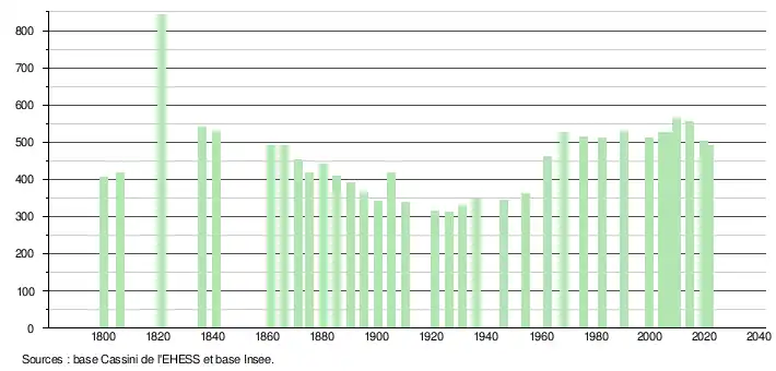 L'évolution du nombre d'habitants est connue à travers les recensements de la population effectués dans la commune depuis 1800. Pour les communes de moins de 10 000 habitants, une enquête de recensement portant sur toute la population est réalisée tous les cinq ans, les populations légales des années intermédiaires étant quant à elles estimées par interpolation ou extrapolation[23]. Pour la commune, le premier recensement exhaustif entrant dans le cadre du nouveau dispositif a été réalisé en 2004[24].