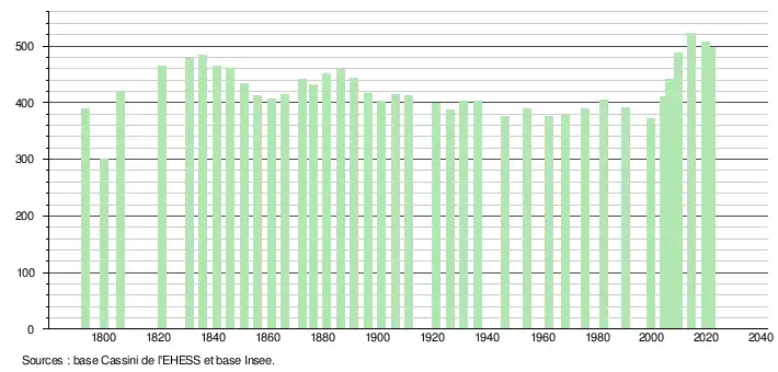 L'évolution du nombre d'habitants est connue à travers les recensements de la population effectués dans la commune depuis 1793. Pour les communes de moins de 10 000 habitants, une enquête de recensement portant sur toute la population est réalisée tous les cinq ans, les populations légales des années intermédiaires étant quant à elles estimées par interpolation ou extrapolation[33]. Pour la commune, le premier recensement exhaustif entrant dans le cadre du nouveau dispositif a été réalisé en 2004[34].