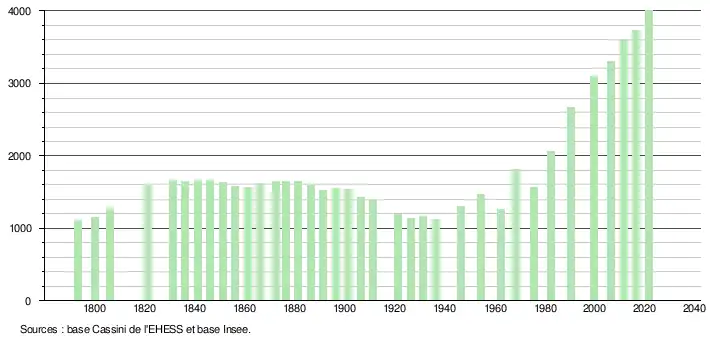 L'évolution du nombre d'habitants est connue à travers les recensements de la population effectués dans la commune depuis 1793. Pour les communes de moins de 10 000 habitants, une enquête de recensement portant sur toute la population est réalisée tous les cinq ans, les populations légales des années intermédiaires étant quant à elles estimées par interpolation ou extrapolation[40]. Pour la commune, le premier recensement exhaustif entrant dans le cadre du nouveau dispositif a été réalisé en 2006[41].