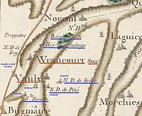 La carte de Cassini ci-dessus montre qu'au milieu du XVIIIe siècle, Vaulx et Vraucourt, qui s'écrit Wraucourt, étaient deux paroisses distinstes avec chacune leur propre église.