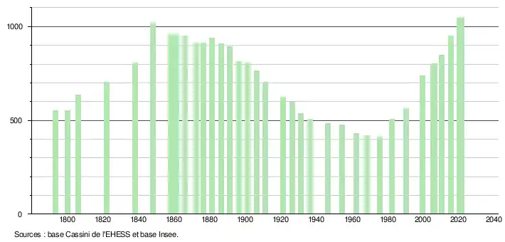 L'évolution du nombre d'habitants est connue à travers les recensements de la population effectués dans la commune depuis 1793. Pour les communes de moins de 10 000 habitants, une enquête de recensement portant sur toute la population est réalisée tous les cinq ans, les populations légales des années intermédiaires étant quant à elles estimées par interpolation ou extrapolation[8]. Pour la commune, le premier recensement exhaustif entrant dans le cadre du nouveau dispositif a été réalisé en 2005[9].