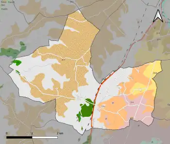 L'occupation des sols de la commune, telle qu'elle ressort de la base de données européenne d’occupation biophysique des sols Corine Land Cover (CLC), est marquée par l'importance des forêts et milieux semi-naturels (59,2 % en 2018), une proportion sensiblement équivalente à celle de 1990 (57,5 %). La répartition détaillée en 2018 est la suivante : forêts (59,2 %), zones agricoles hétérogènes (33,2 %), terres arables (7,5 %)[29]. L'évolution de l’occupation des sols de la commune et de ses infrastructures peut être observée sur les différentes représentations cartographiques du territoire : la carte de Cassini (XVIIIe siècle), la carte d'état-major (1820-1866) et les cartes ou photos aériennes de l'IGN pour la période actuelle (1950 à aujourd'hui)[Carte 3].