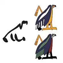 Il représente un vautour au plumage blanc et bleu jusqu'au Moyen Empire renvoyant à un vautour de Rüppel (Gyps rueppelli) ou à un vautour africain (Gyps africanus). Ensuite son plumage devient bigarré rouge, bleu et vert renvoyant là à un vautour fauve (Gyps fulvus) ou bien à un vautour oricou (Torgos tracheliotos). Sa tête peut être blanche et ses serres jaune, il tient le flagellum nekhekh. Il est translittéré Mw.t.