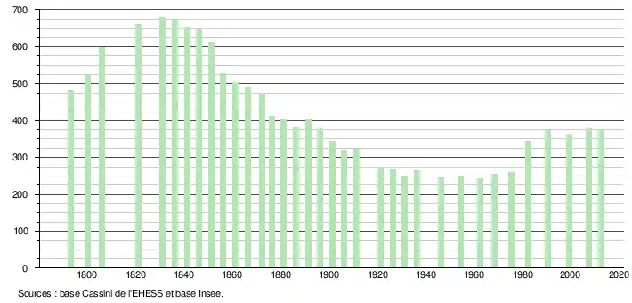 L'évolution du nombre d'habitants est connue à travers les recensements de la population effectués dans la commune depuis 1793. À partir du , les populations légales des communes sont publiées annuellement dans le cadre d'un recensement qui repose désormais sur une collecte d'information annuelle, concernant successivement tous les territoires communaux au cours d'une période de cinq ans. Pour les communes de moins de 10 000 habitants, une enquête de recensement portant sur toute la population est réalisée tous les cinq ans, les populations légales des années intermédiaires étant quant à elles estimées par interpolation ou extrapolation[9]. Pour la commune, le premier recensement exhaustif entrant dans le cadre du nouveau dispositif a été réalisé en 2007[10],[Note 2].