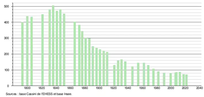 L'évolution du nombre d'habitants est connue à travers les recensements de la population effectués dans la commune depuis 1793. Pour les communes de moins de 10 000 habitants, une enquête de recensement portant sur toute la population est réalisée tous les cinq ans, les populations légales des années intermédiaires étant quant à elles estimées par interpolation ou extrapolation[16]. Pour la commune, le premier recensement exhaustif entrant dans le cadre du nouveau dispositif a été réalisé en 2007[17].