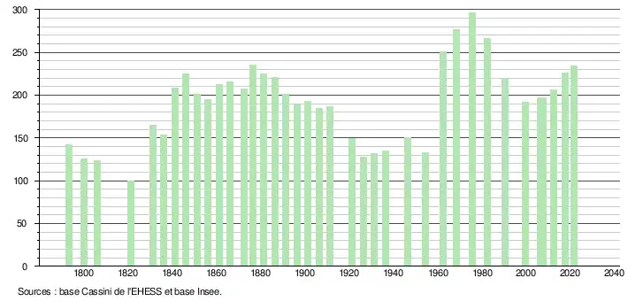 L'évolution du nombre d'habitants est connue à travers les recensements de la population effectués dans la commune depuis 1793. Pour les communes de moins de 10 000 habitants, une enquête de recensement portant sur toute la population est réalisée tous les cinq ans, les populations légales des années intermédiaires étant quant à elles estimées par interpolation ou extrapolation[42]. Pour la commune, le premier recensement exhaustif entrant dans le cadre du nouveau dispositif a été réalisé en 2007[43].