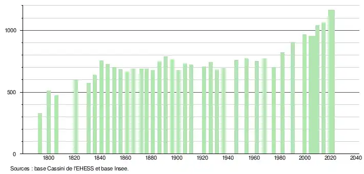 L'évolution du nombre d'habitants est connue à travers les recensements de la population effectués dans la commune depuis 1793. Pour les communes de moins de 10 000 habitants, une enquête de recensement portant sur toute la population est réalisée tous les cinq ans, les populations légales des années intermédiaires étant quant à elles estimées par interpolation ou extrapolation[32]. Pour la commune, le premier recensement exhaustif entrant dans le cadre du nouveau dispositif a été réalisé en 2004[33].