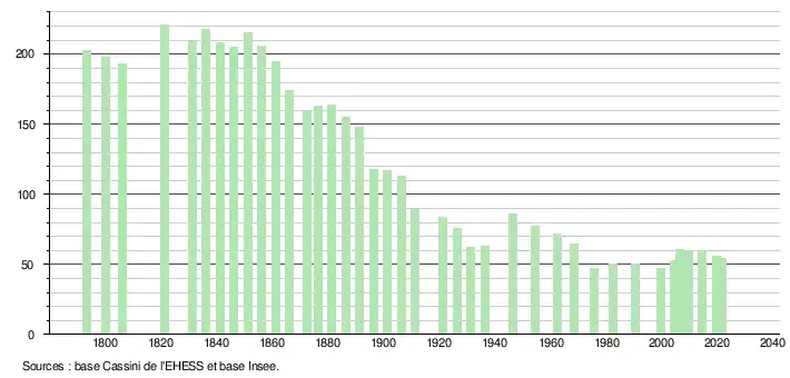 L'évolution du nombre d'habitants est connue à travers les recensements de la population effectués dans la commune depuis 1793. Pour les communes de moins de 10 000 habitants, une enquête de recensement portant sur toute la population est réalisée tous les cinq ans, les populations légales des années intermédiaires étant quant à elles estimées par interpolation ou extrapolation[16]. Pour la commune, le premier recensement exhaustif entrant dans le cadre du nouveau dispositif a été réalisé en 2004[17].