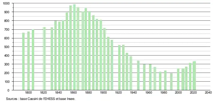 L'évolution du nombre d'habitants est connue à travers les recensements de la population effectués dans la commune depuis 1793. Pour les communes de moins de 10 000 habitants, une enquête de recensement portant sur toute la population est réalisée tous les cinq ans, les populations légales des années intermédiaires étant quant à elles estimées par interpolation ou extrapolation[35]. Pour la commune, le premier recensement exhaustif entrant dans le cadre du nouveau dispositif a été réalisé en 2005[36].