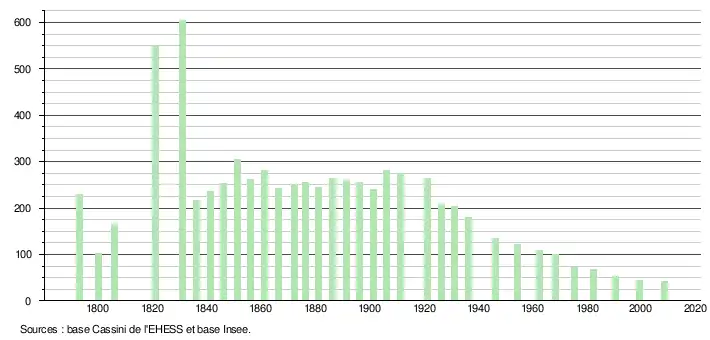L'évolution du nombre d'habitants est connue à travers les recensements de la population effectués dans la commune depuis 1793. À partir du , les populations légales des communes sont publiées annuellement dans le cadre d'un recensement qui repose désormais sur une collecte d'information annuelle, concernant successivement tous les territoires communaux au cours d'une période de cinq ans. Pour les communes de moins de 10 000 habitants, une enquête de recensement portant sur toute la population est réalisée tous les cinq ans, les populations légales des années intermédiaires étant quant à elles estimées par interpolation ou extrapolation[4]. Pour la commune, le premier recensement exhaustif entrant dans le cadre du nouveau dispositif a été réalisé en 2008[5],[Note 1].