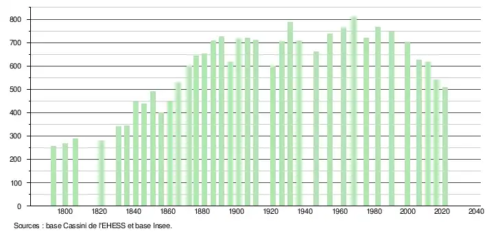L'évolution du nombre d'habitants est connue à travers les recensements de la population effectués dans la commune depuis 1793. Pour les communes de moins de 10 000 habitants, une enquête de recensement portant sur toute la population est réalisée tous les cinq ans, les populations légales des années intermédiaires étant quant à elles estimées par interpolation ou extrapolation[18]. Pour la commune, le premier recensement exhaustif entrant dans le cadre du nouveau dispositif a été réalisé en 2006[19].