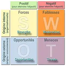 La matrice SWOT (anglais) ou FFOM (français) est un moyen de réaliser une veille concurrentielle, elle permet de mettre en évidence les forces (Strenghs) et faiblesses (Weaknesses) internes à l’entreprise. Ainsi que les opportunités (Opportunities) et menaces (Threats) externes. Ces deux derniers éléments sont particulièrement intéressants dans le cadre d’une veille concurrentielle.