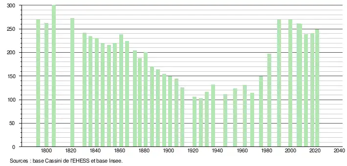 L'évolution du nombre d'habitants est connue à travers les recensements de la population effectués dans la commune depuis 1793. Pour les communes de moins de 10 000 habitants, une enquête de recensement portant sur toute la population est réalisée tous les cinq ans, les populations légales des années intermédiaires étant quant à elles estimées par interpolation ou extrapolation[20]. Pour la commune, le premier recensement exhaustif entrant dans le cadre du nouveau dispositif a été réalisé en 2007[21].