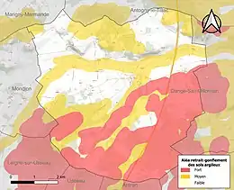 Les mouvements de terrains susceptibles de se produire sur la commune sont des affaissements et effondrements liés aux cavités souterraines (hors mines) et des tassements différentiels[25]. Afin de mieux appréhender le risque d’affaissement de terrain, un inventaire national permet de localiser les éventuelles cavités souterraines sur la commune[26]. Le retrait-gonflement des sols argileux est susceptible d'engendrer des dommages importants aux bâtiments en cas d’alternance de périodes de sécheresse et de pluie[27]. 66,5 % de la superficie communale est en aléa moyen ou fort (79,5 % au niveau départemental et 48,5 % au niveau national)[Carte 2]. Depuis le , en application de la loi ÉLAN, différentes contraintes s'imposent aux vendeurs, maîtres d'ouvrages ou constructeurs de biens situés dans une zone classée en aléa moyen ou fort[Note 4],[28].