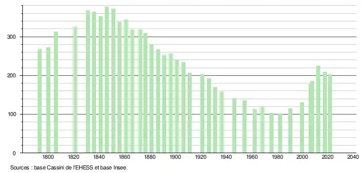 L'évolution du nombre d'habitants est connue à travers les recensements de la population effectués dans la commune depuis 1793. Pour les communes de moins de 10 000 habitants, une enquête de recensement portant sur toute la population est réalisée tous les cinq ans, les populations légales des années intermédiaires étant quant à elles estimées par interpolation ou extrapolation[19]. Pour la commune, le premier recensement exhaustif entrant dans le cadre du nouveau dispositif a été réalisé en 2007[20].