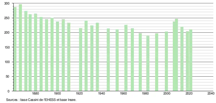 L'évolution du nombre d'habitants est connue à travers les recensements de la population effectués dans la commune depuis 1861. Pour les communes de moins de 10 000 habitants, une enquête de recensement portant sur toute la population est réalisée tous les cinq ans, les populations légales des années intermédiaires étant quant à elles estimées par interpolation ou extrapolation[15]. Pour la commune, le premier recensement exhaustif entrant dans le cadre du nouveau dispositif a été réalisé en 2008[16].