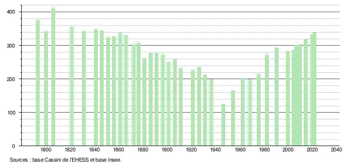 L'évolution du nombre d'habitants est connue à travers les recensements de la population effectués dans la commune depuis 1793. Pour les communes de moins de 10 000 habitants, une enquête de recensement portant sur toute la population est réalisée tous les cinq ans, les populations légales des années intermédiaires étant quant à elles estimées par interpolation ou extrapolation[22]. Pour la commune, le premier recensement exhaustif entrant dans le cadre du nouveau dispositif a été réalisé en 2004[23].