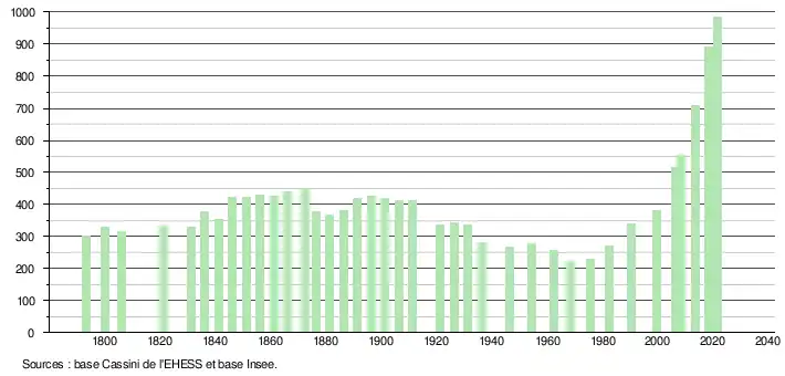 L'évolution du nombre d'habitants est connue à travers les recensements de la population effectués dans la commune depuis 1793. Pour les communes de moins de 10 000 habitants, une enquête de recensement portant sur toute la population est réalisée tous les cinq ans, les populations légales des années intermédiaires étant quant à elles estimées par interpolation ou extrapolation[18]. Pour la commune, le premier recensement exhaustif entrant dans le cadre du nouveau dispositif a été réalisé en 2008[19].