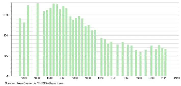 L'évolution du nombre d'habitants est connue à travers les recensements de la population effectués dans la commune depuis 1793. Pour les communes de moins de 10 000 habitants, une enquête de recensement portant sur toute la population est réalisée tous les cinq ans, les populations légales des années intermédiaires étant quant à elles estimées par interpolation ou extrapolation[17]. Pour la commune, le premier recensement exhaustif entrant dans le cadre du nouveau dispositif a été réalisé en 2006[18].