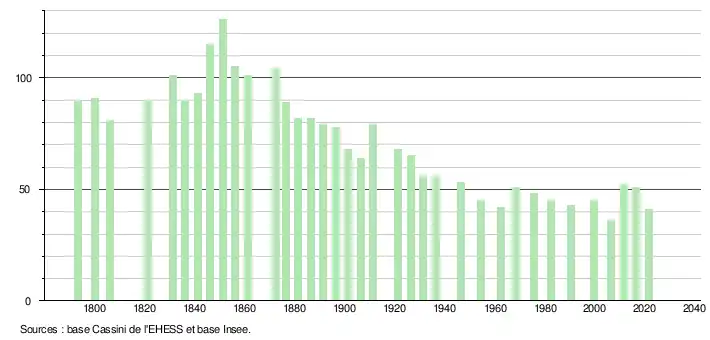 L'évolution du nombre d'habitants est connue à travers les recensements de la population effectués dans la commune depuis 1793. Pour les communes de moins de 10 000 habitants, une enquête de recensement portant sur toute la population est réalisée tous les cinq ans, les populations légales des années intermédiaires étant quant à elles estimées par interpolation ou extrapolation[56]. Pour la commune, le premier recensement exhaustif entrant dans le cadre du nouveau dispositif a été réalisé en 2006[57].