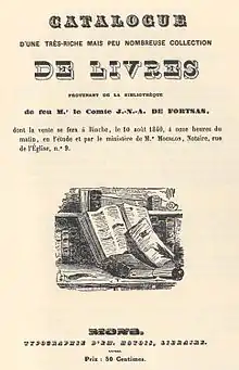 Le catalogue prétendait que « Jean Népomucène Auguste Pichauld, comte de Fortsas » collectionnait les livres uniques, c'est-à-dire des livres dont il existait un seul exemplaire connu. À sa mort, le 1er septembre 1839, il en aurait possédé 52 différents. Peu intéressés par la bibliophilie, ses héritiers auraient décidé de vendre la collection aux enchères. La vente devait avoir lieu le 10 août 1840.