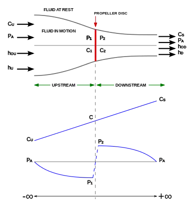 Pour satisfaire la contrainte de continuité à travers le disque d'hélice, les vitesses C1 et C2 doivent être égales (C1 = C2 = C), évitant ainsi une onde de choc. En revanche, une différence de pression totale (dynamique et stagnante) est générée à travers le disque[1].
