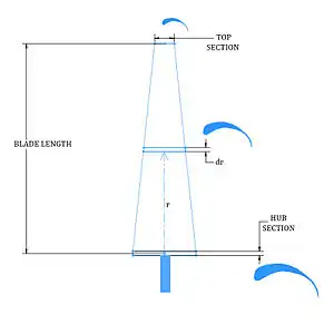 Dans cette théorie, un élément infinitésimal () est pris à une distance du pied de la pale et toutes les forces agissant sur l'élément sont analysées pour obtenir une solution. On suppose que l'écoulement à travers chaque section élémentaire radiale est indépendant de l’écoulement à travers les autres éléments[1],[3].