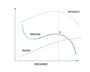 La relation entre le différentiel de pression et le débit volumique est une caractéristique importante des ventilateurs. Les caractéristiques typiques des ventilateurs axiaux peuvent être étudiées à partir des courbes de performances. Une courbe de performances de ventilateur axial est présentée sur la figure. (La ligne verticale joignant le point d'efficacité maximale est tracée et rencontre la courbe de pression au point "S")[1]. On peut faire les observations suivantes: