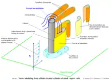 Une telle diminution n'est pas surprenante en Mécanique des fluides[réf. nécessaire] puisque le des corps suscitant un écoulement 3D est toujours beaucoup plus faible que le des corps suscitant un écoulement 2D, ceci parce qu'un corps suscitant un écoulement 3D offre toujours plus de voies à son contournement par le fluide qu'un corps suscitant un écoulement 2D[n 2] : le d'un cylindre court est donc forcément plus faible que celui du cylindre infini[réf. nécessaire].