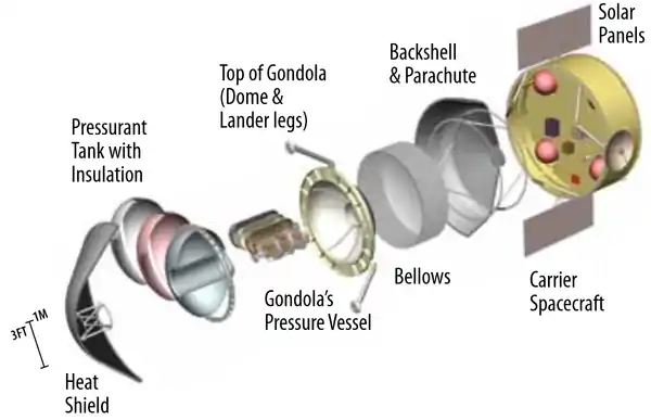 - la gondole pressurisée et isolée sur le plan thermique d'une masse de 1 782 kg qui contient les 41 kg d'instruments scientifiques et les équipements permettant de faire fonctionner la sonde.