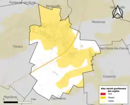 Le retrait-gonflement des sols argileux est susceptible d'engendrer des dommages importants aux bâtiments en cas d’alternance de périodes de sécheresse et de pluie. 55 % de la superficie communale est en aléa moyen ou fort (52,8 % au niveau départemental et 48,5 % au niveau national). Sur les 352 bâtiments dénombrés sur la commune en 2019, 351 sont en aléa moyen ou fort, soit 100 %, à comparer aux 70 % au niveau départemental et 54 % au niveau national. Une cartographie de l'exposition du territoire national au retrait gonflement des sols argileux est disponible sur le site du BRGM[20],[Carte 2].