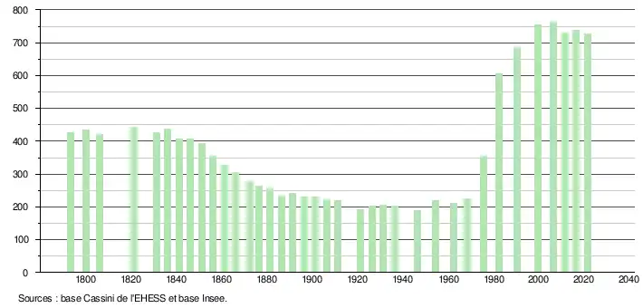 L'évolution du nombre d'habitants est connue à travers les recensements de la population effectués dans la commune depuis 1793. Pour les communes de moins de 10 000 habitants, une enquête de recensement portant sur toute la population est réalisée tous les cinq ans, les populations légales des années intermédiaires étant quant à elles estimées par interpolation ou extrapolation[22]. Pour la commune, le premier recensement exhaustif entrant dans le cadre du nouveau dispositif a été réalisé en 2006[23].