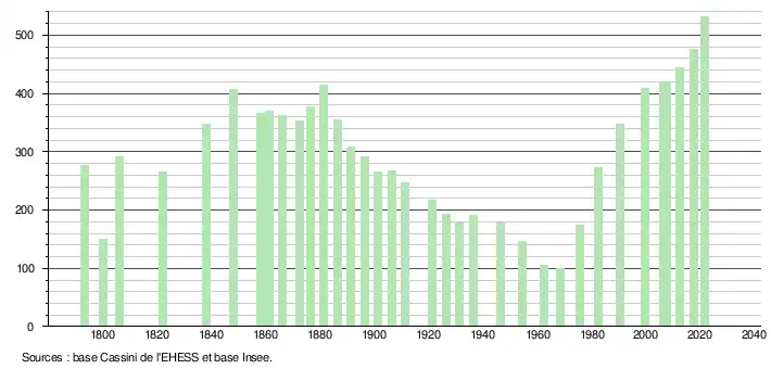 L'évolution du nombre d'habitants est connue à travers les recensements de la population effectués dans la commune depuis 1793. Pour les communes de moins de 10 000 habitants, une enquête de recensement portant sur toute la population est réalisée tous les cinq ans, les populations légales des années intermédiaires étant quant à elles estimées par interpolation ou extrapolation[12]. Pour la commune, le premier recensement exhaustif entrant dans le cadre du nouveau dispositif a été réalisé en 2007[13].