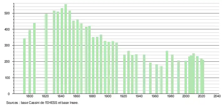 L'évolution du nombre d'habitants est connue à travers les recensements de la population effectués dans la commune depuis 1793. Pour les communes de moins de 10 000 habitants, une enquête de recensement portant sur toute la population est réalisée tous les cinq ans, les populations légales des années intermédiaires étant quant à elles estimées par interpolation ou extrapolation[28]. Pour la commune, le premier recensement exhaustif entrant dans le cadre du nouveau dispositif a été réalisé en 2004[29].