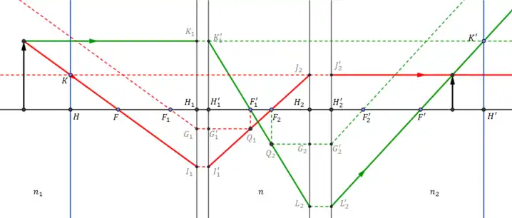 Ainsi, la vergence du système est égale à la vergence de son foyer image, ou, ce qui revient au même, à l'opposé de la vergence de son foyer objet.