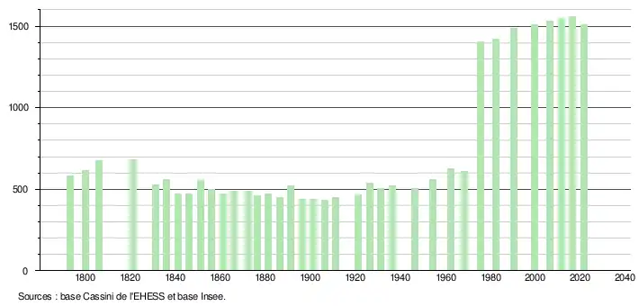 L'évolution du nombre d'habitants est connue à travers les recensements de la population effectués dans la commune depuis 1793. Pour les communes de moins de 10 000 habitants, une enquête de recensement portant sur toute la population est réalisée tous les cinq ans, les populations légales des années intermédiaires étant quant à elles estimées par interpolation ou extrapolation[18]. Pour la commune, le premier recensement exhaustif entrant dans le cadre du nouveau dispositif a été réalisé en 2006[19].