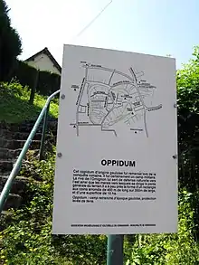L'oppidum de Vermand est le seul qui soit connu pour les Viromanduens. Sur le panneau informatif ci-contre, les quelques marches visibles en arrière-plan et le pignon de la maison derrière le talus permettent une estimation de sa hauteur. Il semble probable qu'il constituait leur place forte principale. En tout cas, c'était vraisemblablement le chef-lieu de ce peuple dans les années qui suivirent la conquête, jusqu'à la fondation d'un nouveau chef-lieu à Saint-Quentin : Augusta Viromanduorum.