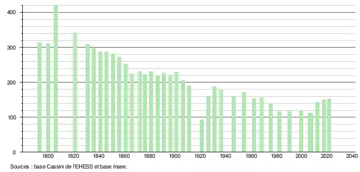 L'évolution du nombre d'habitants est connue à travers les recensements de la population effectués dans la commune depuis 1793. Pour les communes de moins de 10 000 habitants, une enquête de recensement portant sur toute la population est réalisée tous les cinq ans, les populations légales des années intermédiaires étant quant à elles estimées par interpolation ou extrapolation[43]. Pour la commune, le premier recensement exhaustif entrant dans le cadre du nouveau dispositif a été réalisé en 2007[44].