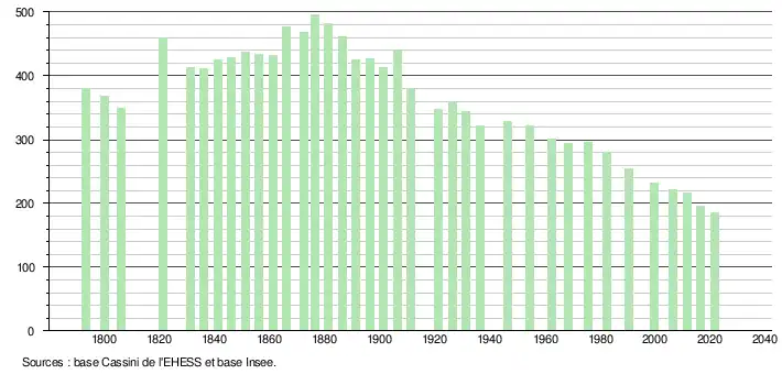 L'évolution du nombre d'habitants est connue à travers les recensements de la population effectués dans la commune depuis 1793. Pour les communes de moins de 10 000 habitants, une enquête de recensement portant sur toute la population est réalisée tous les cinq ans, les populations légales des années intermédiaires étant quant à elles estimées par interpolation ou extrapolation[23]. Pour la commune, le premier recensement exhaustif entrant dans le cadre du nouveau dispositif a été réalisé en 2006[24].