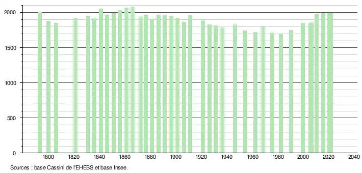 L'évolution du nombre d'habitants est connue à travers les recensements de la population effectués dans la commune depuis 1793. Pour les communes de moins de 10 000 habitants, une enquête de recensement portant sur toute la population est réalisée tous les cinq ans, les populations légales des années intermédiaires étant quant à elles estimées par interpolation ou extrapolation[27]. Pour la commune, le premier recensement exhaustif entrant dans le cadre du nouveau dispositif a été réalisé en 2005[28].