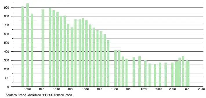 L'évolution du nombre d'habitants est connue à travers les recensements de la population effectués dans la commune depuis 1793. Pour les communes de moins de 10 000 habitants, une enquête de recensement portant sur toute la population est réalisée tous les cinq ans, les populations légales des années intermédiaires étant quant à elles estimées par interpolation ou extrapolation[14]. Pour la commune, le premier recensement exhaustif entrant dans le cadre du nouveau dispositif a été réalisé en 2004[15].