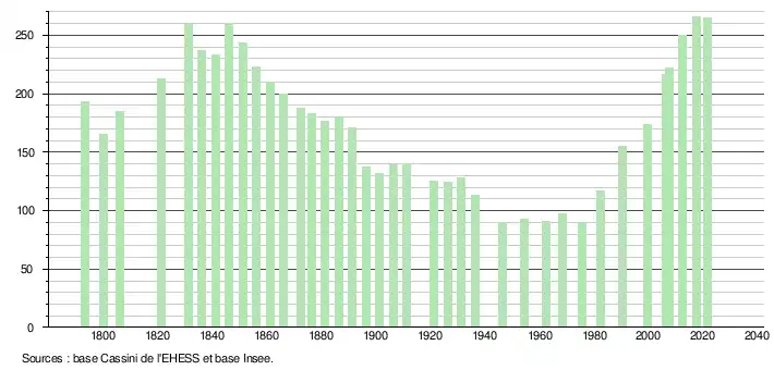 L'évolution du nombre d'habitants est connue à travers les recensements de la population effectués dans la commune depuis 1793. Pour les communes de moins de 10 000 habitants, une enquête de recensement portant sur toute la population est réalisée tous les cinq ans, les populations légales des années intermédiaires étant quant à elles estimées par interpolation ou extrapolation[18]. Pour la commune, le premier recensement exhaustif entrant dans le cadre du nouveau dispositif a été réalisé en 2007[19].