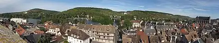 L'occupation des sols de la commune, telle qu'elle ressort de la base de données européenne d'occupation biophysique des sols Corine Land Cover (CLC), est marquée par l'importance des forêts et milieux semi-naturels (54,6 % en 2018), une proportion identique à celle de 1990 (54,8 %). La répartition détaillée en 2018 est la suivante : forêts (54,4 %), zones urbanisées (17,3 %), terres arables (8,8 %), zones industrielles ou commerciales et réseaux de communication (7,2 %), prairies (5,9 %), eaux continentales[Note 3] (2,9 %), espaces verts artificialisés, non agricoles (2,2 %), zones agricoles hétérogènes (1,1 %), milieux à végétation arbustive et/ou herbacée (0,2 %)[28]. L'évolution de l’occupation des sols de la commune et de ses infrastructures peut être observée sur les différentes représentations cartographiques du territoire : la carte de Cassini (XVIIIe siècle), la carte d'état-major (1820-1866) et les cartes ou photos aériennes de l'IGN pour la période actuelle (1950 à aujourd'hui)[Carte 1].