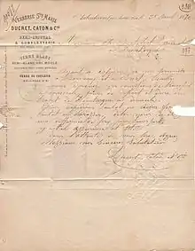 Société CATON père et Cie, « Verrerie Sainte-Marie »,à Auberchicourt. M. Auguste Caton cède à Veuve Caton de tous ses droits dans la société dont la raison devient CATON et Cie le [9]