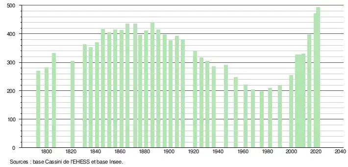 L'évolution du nombre d'habitants est connue à travers les recensements de la population effectués dans la commune depuis 1793. Pour les communes de moins de 10 000 habitants, une enquête de recensement portant sur toute la population est réalisée tous les cinq ans, les populations légales des années intermédiaires étant quant à elles estimées par interpolation ou extrapolation[18]. Pour la commune, le premier recensement exhaustif entrant dans le cadre du nouveau dispositif a été réalisé en 2004[19].