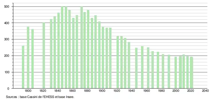 L'évolution du nombre d'habitants est connue à travers les recensements de la population effectués dans la commune depuis 1793. Pour les communes de moins de 10 000 habitants, une enquête de recensement portant sur toute la population est réalisée tous les cinq ans, les populations légales des années intermédiaires étant quant à elles estimées par interpolation ou extrapolation[17]. Pour la commune, le premier recensement exhaustif entrant dans le cadre du nouveau dispositif a été réalisé en 2005[18].