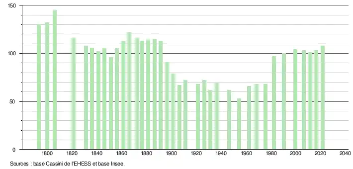 L'évolution du nombre d'habitants est connue à travers les recensements de la population effectués dans la commune depuis 1793. Pour les communes de moins de 10 000 habitants, une enquête de recensement portant sur toute la population est réalisée tous les cinq ans, les populations légales des années intermédiaires étant quant à elles estimées par interpolation ou extrapolation[21]. Pour la commune, le premier recensement exhaustif entrant dans le cadre du nouveau dispositif a été réalisé en 2006[22].